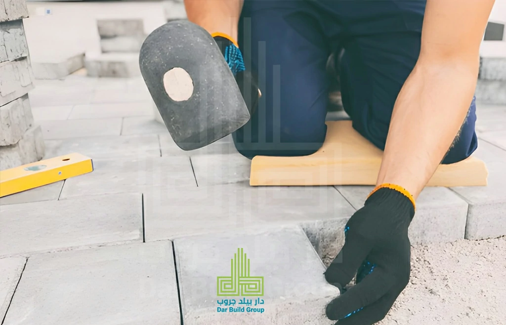بعد الانتهاء من الرصف يستخدم دكاك اهتزازي لتثبيت البلاط مع إضافة طبقة خفيفة من الرمل الجاف لملء الفراغات.