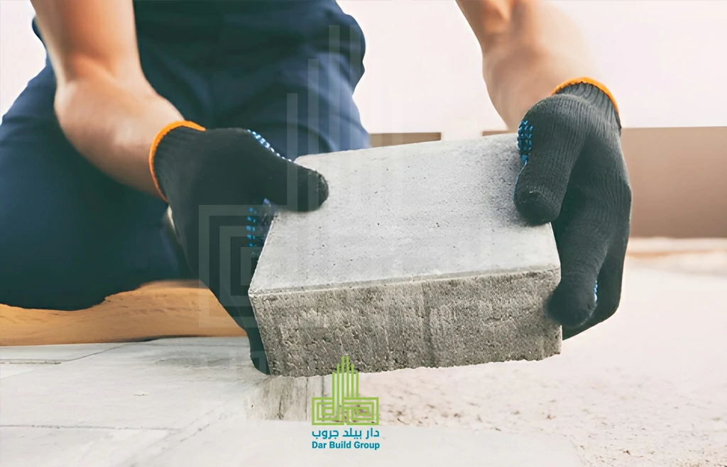 ترص وحدات الأنترلوك يدويًا بطريقة متشابكة وفق التصميم المحدد لضمان التناسق والثبات بين القطع.